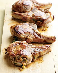 1. Mix together apricots, almonds, parsley, and 1 tablespoon oil. Season with salt and pepper. Cut a 2-inch slit into the side of each pork chop using a paring knife, cutting through to the bone to form a pocket. Fill each pocket with 2 tablespoons apricot stuffing, and press to flatten. Season with salt and pepper.