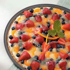 In a small bowl, beat the cream cheese, sugar and vanilla until smooth. Spread over crust. Arrange the strawberries, oranges and blueberries on top.