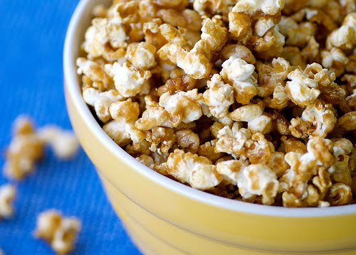 2. Pour oil in a large saucepan over high heat and cover. After 1-2 minutes, toss a couple of kernels inside. Listen for the shimmering oil as it heats up, then drop a couple of kernels in the pan. When they start sizzling and spinning, the oil is ready. Add remaining kernels. Cover the pan, and give it a couple of shakes so the kernels get coated with oil. Now listen for the popping. Once it really starts popping quickly, listen carefully. Remove the pan from the heat once the popping slows down to every few seconds, or it could burn quickly. Pour popcorn into a big bowl coated with cooking spray, and add nuts.