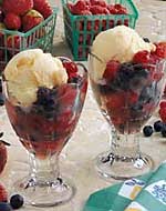 In a large heat-proof bowl, combine fruit and 2 tablespoons sugar. In a saucepan, combine cornstarch and juice until smooth. Bring to a boil; cook and stir for 2 minutes or until thickened. Remove from the heat; cool for 10 minutes. Pour over fruit; toss to coat. Sprinkle with remaining sugar. Cover and refrigerate until chilled. Serve in individual dessert dishes; top with frozen yogurt if desired.