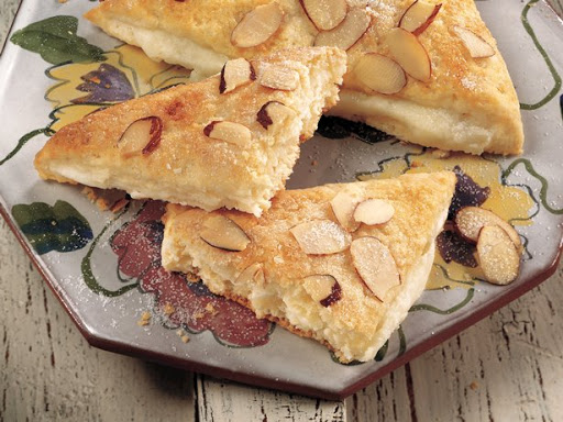 3. In small bowl, mix 8-oz package of cream cheese, 1/3 cup sugar and the almond extract until smooth. Spread cream cheese filling lengthwise over half of dough to within 1/4 inch of edge; carefully fold dough over filling. Brush egg white over top. Sprinkle with almonds and 2 teaspoons sugar. Cut into 4 (4-inch) squares; cut squares diagonally in half to form 8 triangles. Place on ungreased cookie sheet.