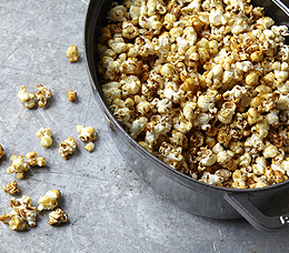 Warm the oil and three kernels of popcorn in a large, heavy-bottomed, lidded pot over medium-high heat. When the kernels pop, add the sugar and shake the pot until the sugar melts, 10 seconds. Add the rest of the popcorn, cover, and in 5-second intervals alternate lifting and shaking the pot with letting it stand on the burner. Once the popping slows, pour the popcorn into a huge bowl, drizzle in the butter mixture, and sprinkle with salt. Toss to coat, and serve immediately.