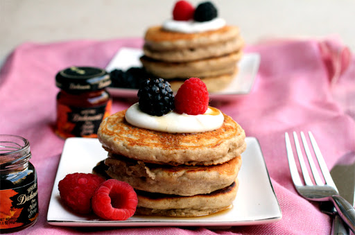 Whisk the yogurt, egg and oil together until combined (I do this in my glass measuring cup). In another bowl, combine the flours, salt, baking soda, baking powder and malted milk powder. Fold the yogurt mixture into the dry ingredients until combined. Mixture should be thick, more like a muffin batter. If you prefer thinner pancakes, thin out the mixture with a few tablespoons of milk.