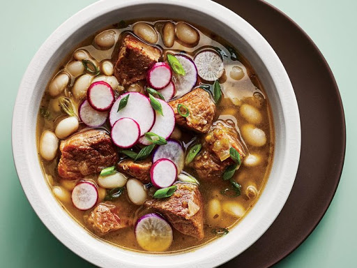 Combine chicken stock, beans, white onion, salsa, 1/2 cup water, cumin, oregano, salt, garlic, and pork in a 5- to 6-quart slow cooker. Cover, and cook on low 7 hours and 30 minutes to 8 hours. Sprinkle with green onions and radishes, if desired, before serving.