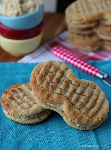 6.Spread a heaping tablespoon of filling onto the bottom of one of the peanut butter cookies and then top with another cookie to create sandwich.