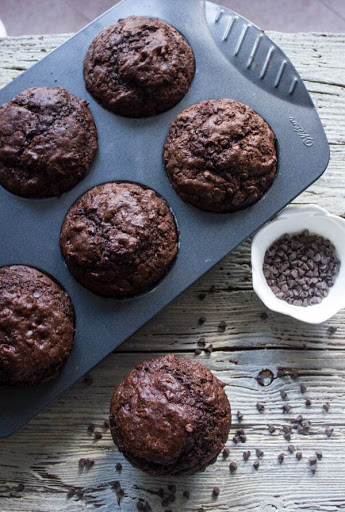Big Double Chocolate Chip Muffins, moist and easy, a bakery style jumbo muffin recipe, extra chocolatey and so delicious.