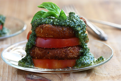 8. Grab a plate and stack tomatoes and mozzarella in whatever fashion you like. Top with pesto and a crack of black pepper.