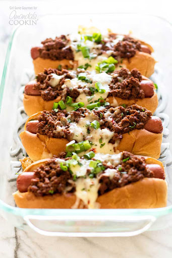 Place the hot dog buns in a 9 x 13 baking dish. Place a hot dog in each. Top each dog with some chili and the shredded cheese. Bake uncovered for 20-25 minutes.