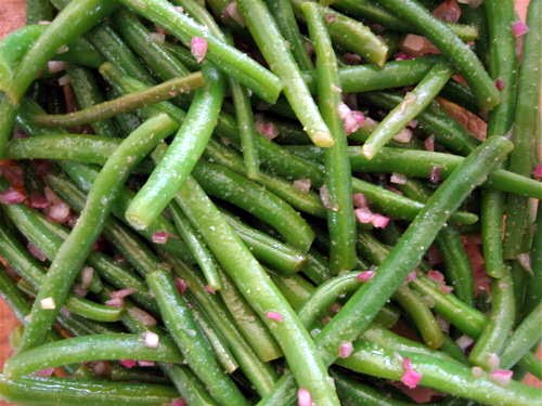 Boil beans 4 minutes until crisp-tender and plunge into ice water and drain. Whisk worcestershire sauce and next 4 ingredients in a small bowl. Pour into bag with beans and onions and marinade beans. Chill for 3 hours and serve