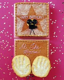 7.Decorate handprint square: Set cookie handprints on lower half of cake, extending over the edge. Using a pastry bag fitted with an Ateco #3 plain tip and filled with pink buttercream, write the birthday-girl's name above handprints. Pipe "happy birthday" on star cake, above the camera. Arrange cakes next to each other to resemble two sidewalk squares.