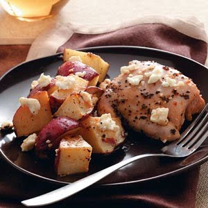 In a large bowl, combine the first five ingredients. Transfer to a 13-in. x 9-in. baking dish coated with cooking spray. Cover and bake at 400° for 40 minutes. Sprinkle with cheese. Bake, uncovered, 10-15 minutes longer or until chicken juices run clear and potatoes are tender. Yield: 6 servings.