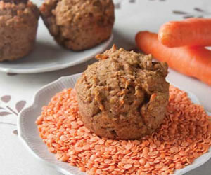 Place cooked lentils, applesauce, honey, oil and sugar in a blender or food processor container and blend until smooth. Add lentil mixture to flour mixture and mix until everything is moist. Fold in carrots.