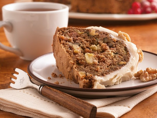 This cake tastes very good, but I have a couple of suggestions. Firstly, I would use shortening to grease the pan instead of spray. My cake stuck to the pan and came out in several pieces. Secondly, I would add raisins to the batter; raisins are always so good with fruit cakes. I also used a less sweet glaze instead of the thick frosting in the recipe. The cake is already very sweet, and I thought it would be overkill to completely frost it. Good flavor, though.