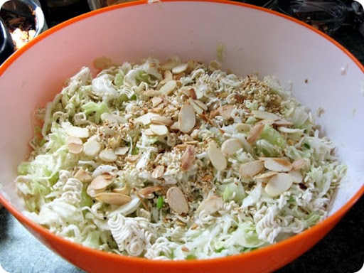 In large bowl, mix salad ingredients until they are well blended. In a jar, mix the dressing ingredients, shaking very well. Pour dressing over salad and toss to combine. Refrigerate until needed. Toss gently before serving.