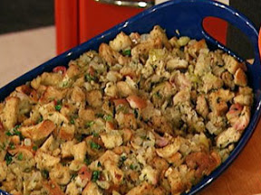 Butter a casserole dish with the remaining 2 tablespoons of butter. Remove the bay leaf from the stuffing then scoop into dish. Bake until golden brown and crisp on top, about 10 to 15 minutes. Serve hot or at room temperature.