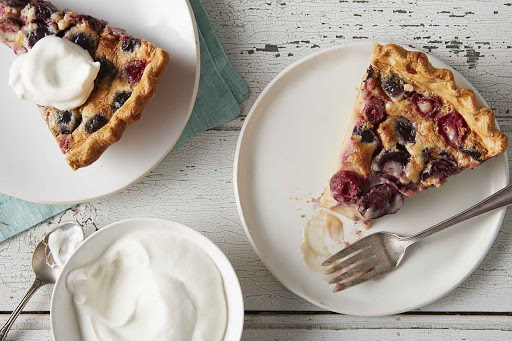 These days, truly delicious sweet cherries — firm, deep red, and unbelievably sweet — are pretty commonly available at certain times of the year. And when that time arrives, we suggest trying this pie, an almond-scented custard studded with cherries, nestled in a buttery crust, and crowned with chantilly cream.