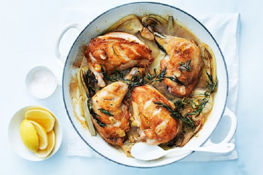 Preheat oven to 350°F. Heat a heavy ovenproof pot or Dutch oven on a stovetop over high heat. Score the chicken skin at regular intervals, drizzle with the oil, sprinkle with salt and pepper and toss to coat. Add to the pot and cook for 6–8 minutes on each side or until well browned. Remove from the pot and set aside. Add the tarragon, lemon zest, garlic and fennel to the pot and cook for 2–3 minutes or until golden. Return the chicken to the pot with the wine and stock and bring to a simmer.