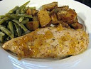 In same skillet, melt remaining butter. Stir in cornstarch mixture and add to pan. Bring to boil; cook and stir for 2 minutes or until thickened. Ad chicken and peaches; heat through. Sprinkle with onions.