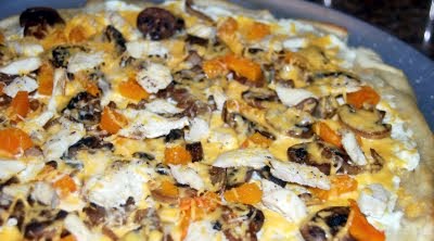 Remove dough from oven and top with ricotta, onions, mushrooms, butternut squash & turkey. Top with shredded cheese. Bake for about 6-7 minutes until crust is golden brown and cheese is bubbly. I like to broil mine on high right before I take it out for about a minute or two, but watch closely so it doesn't burn.