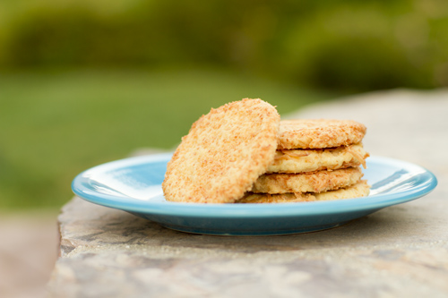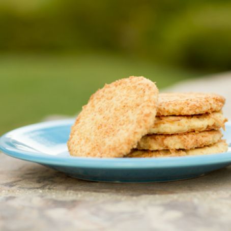 Scrape bowl down and scoop dough out into about 1 inch balls and roll in dried coconut. Place on an ungreased cookie sheet and press down into a thin disk with the bottom of a glass or hands. Cookies will not puff and spread much.