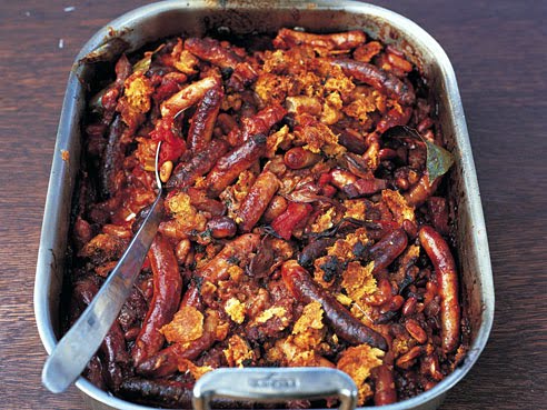 This dish was inspired by a builder called Dusty, who kept talking about a sausage casserole. So I made this one up very quickly, basing it on a French cassoulet-type thing. It's nice and easy to cook for a group as it's all done in one dish. While I was going sausage-mad, I realized that we're fantastically lucky these days to have great sausages available in the supermarkets, farmers' markets and good local butchers. In this dish feel free to use any sausages you like.