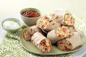 SPOONchicken mixture down centers of tortillas. Fold in sides of tortillas, then roll up burrito-style. Secure with toothpicks, if desired.