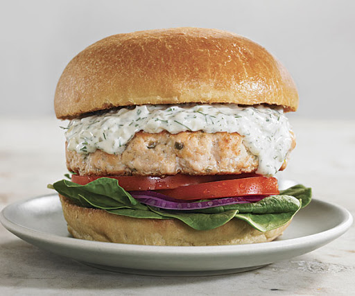 Fresh salmon, punched up with shallots, capers, and mustard, make up these savory burgers. Dress them with spinach, tomato, and a creamy dill sauce. Do make the sauce ahead of time. It could be a bit runny otherwise.