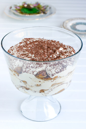 5. Dip lady fingers in coffee for 3-4 minutes on each side. Then layer lady fingers, filling and grated chocolate in a trifle bowl, a 8 x 8 casserole, or any other 2 quart or more container.