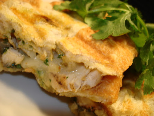Spread each slice of bread with butter on one side. Spread cilantro pesto on the other side of two slices and top with cheese and chicken. Spread the other two slices with the mayo mixture and place on top of the chicken, butter side up. Toast in Foreman grill or in a skillet with a weight on top. (Cook over medium heat. When first side is browned, flip over and cook the other side, weighting again.).
