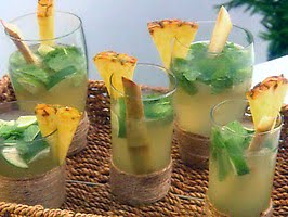 Divide the mint, sugar, and lime wedges among 4 old-fashioned glasses. Using a pestle (from a mortar and pestle) or the end of a wooden spoon, mash the mint, sugar, and lime together. Add some ice and top off with some pineapple juice concentrate, white rum, and club soda. Swirl with a sugar cane stick and serve.