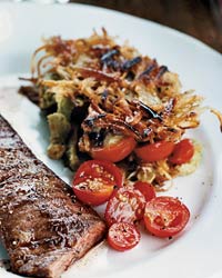 Heat a large griddle over moderately low heat or on a preheated grill. On a work surface, using a box grater, coarsely shred the potatoes into 10 fluffy piles—don't pat the piles down.