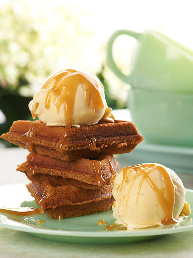 Spray the waffle iron with nonstick cooking spray and make the waffles. (Refer to your waffle iron instruction manual for help.) Spoon the ice cream over the waffles and serve immediately.