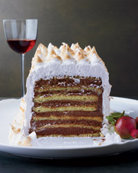 Spread a thin layer of the meringue all over the cake, then use the remaining meringue to form decorative swirls on the cake. Using a brulée torch, brown the meringue all over. Refrigerate the cake for at least 1 hour before serving.