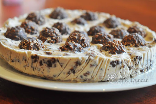 5. Pour mixture in lined cake pan, decorate with Ferrero Rocher chocolates.