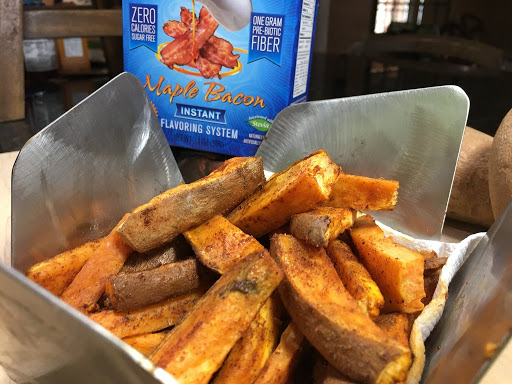 Wash and slice the sweet potato into equally shaped fries. Place on baking sheet and drizzle with olive oil or melted coconut oil. Gently toss to coat. Sprinkle paprika, sea salt and ground pepper. Bake in oven at 500 degrees for 30-35 min or until crispy on the outside and soft on the inside. After plating, while still hot, sprinkle with Maple Bacon Flex Flavors. Gently toss while the flavor melts in. Enjoy this sweet and savory clean side dish!