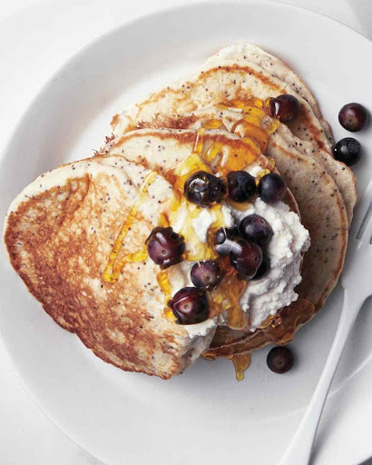 Serve, with butter, ricotta, blueberries, and more syrup.
