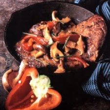 While the meat is cooking, make your gravy. Start by sauteing the onions and mushrooms with salt and pepper until golden, add some chopped garlic and the veal stock along with 1/4 cup of red wine. Reduce for about 5 minutes. If you want the sauce thicker you can add some corn starch to some cold stock, shake well and add to the mushroom gravy to thicken. You need to bring it to a boil so that it will get nice and thick.