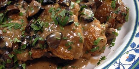 3. Meanwhile, melt a little butter in a frying pan and cook the mushrooms until golden. When the chicken is cooked, remove it to a serving platter and keep warm. Boil the cooking liquid down to sauce consistency. Stir in the cream and the mushrooms. When hot, taste and correct the seasonings. Pour over the chicken, scatter over the parsley, and serve.
