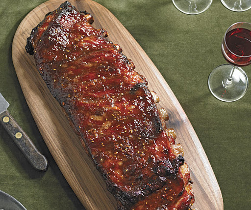 Raise the oven temperature to 425°F. Brush the ribs with one bowl of the glaze and continue to roast, brushing every couple minutes, until the glaze browns and caramelizes, about 10 minutes total. Remove from the oven and let cool for a couple minutes, then transfer the ribs to a cutting board and cut the racks in half (meaty side down so they’re easier to slice). Serve with the remaining glaze for dipping.