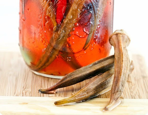 Combine the rest of the ingredients, except the chilies and okra in a pot on the stove and bring to a boil. You can use the same pot you used to sterilize the jars. When boiling, reduce heat and simmer for about 3 minutes. Taste the brine and adjust the seasonings to your taste.