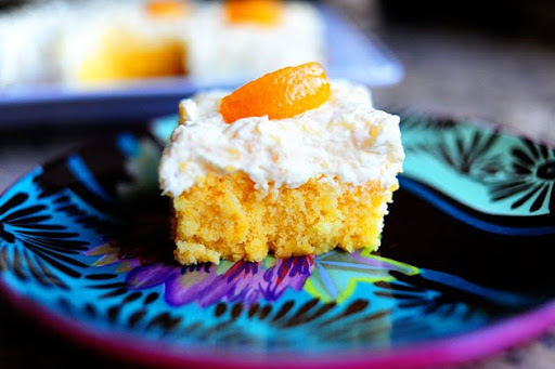 To serve, cut cake into squares and top each square with a mandarin orange slice.