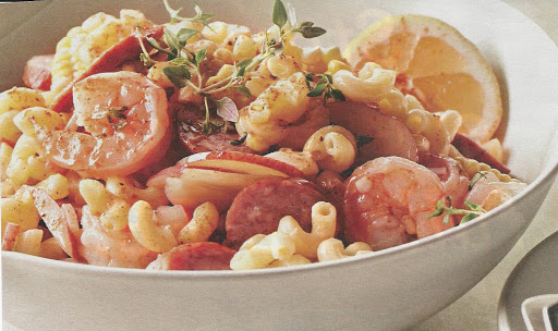 5. In a large bowl combine macaroni, corn kernels, shrimp, potatoes, and sausage. Add dressing and 1 Tablespoon thyme; toss gently to combine. Serve at once or cover and chill up to 24 hours. Sprinkle with additional fresh thyme and Old Bay seasoning, and serve with lemon wedges.