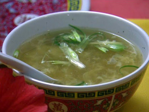 Boil up and pour in the beaten eggs. Keep at a rapid boil, stirring until the eggs shreds. Then add the watercress and cook only about a minute longer.