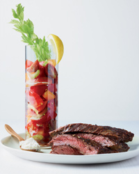 Light a grill or preheat a grill pan. Rub the remaining 2 tablespoons of canola oil all over the steak and season with salt and black pepper. Grill the steak over moderately high heat, turning once, until nicely charred, 3 to 4 minutes per side for medium-rare. Transfer the steak to a work surface and let rest for 5 minutes. Slice the steak across the grain and serve with the tomato salad and horseradish cream.
