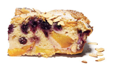 Reduce mixer speed to low. Add half the flour mixture, then the sour cream, and then the remaining flour mixture, mixing well between additions. Fold in the peaches and blueberries. (Don’t worry if there seems to be too much fruit in proportion to batter. The batter will rise around it while baking.)