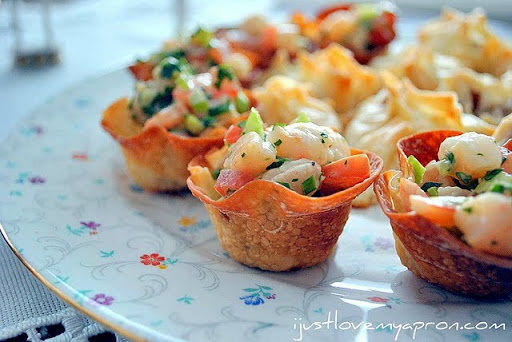 * If you'd like to make it ahead of time so that you won't have to be too busy on the day of, you can chop all the herbs and vegetables in a separate containers. The mayo mixture in another container. On the day of, bake the gyoza skins, mix the mixture and everything else together. Fill the cups before serving.