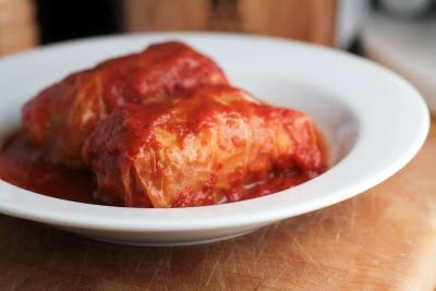 Lay the cabbage leaves on a work surface and blot dry with paper towels. Slice off the ridged part of the thick rib at the bottom each leaf, creating a level surface over the leaves. Place about 1/2 cup of the beef mixture in the bottom center of each roll. Roll the bottom of a leaf over the beef mixture, fold in the sides, and continue rolling forward until completely closed. Repeat with the remaining leafs. Arrange the rolls seam side-down in a 9-x 13- x 2- inch oval gratin dish.