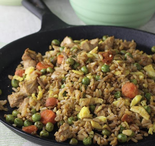 Heat oil in a large skillet over medium heat. Scramble eggs in oil. When eggs are set, remove from pan and chop. Lightly spray the same skillet with non-stick cooking spray and place over medium heat. Add peas, carrot and onion to skillet. Cook for 2 to 3 minutes, until vegetables are crisp-tender. Add chopped scrambled eggs and remaining ingredients to vegetable mixture. Cook, stirring occasionally, until mixture is heated through.