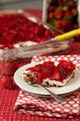 Mix 2 cups boiling water with the Jello, stir to dissolve. Chill until almost congealed. Add the fresh strawberries, stirring to mix. Pour over cheese layer and refrigerate for at least an hour before serving.