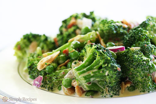 2 Combine broccoli florets, almonds, crumbled bacon, chopped onion, and peas in a large serving bowl. In a separate bowl, whisk together mayonnaise, cider vinegar and honey. Add dressing to the salad and toss to mix well. Chill thoroughly before serving.